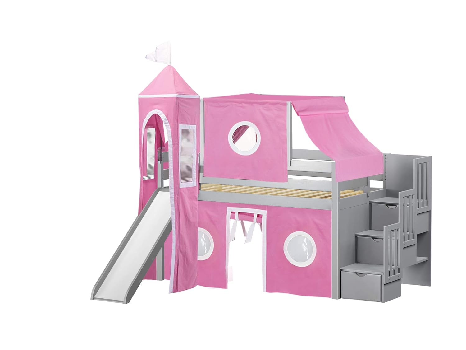 Jackpot Princess Low Loft Stairway Bed With Slide Pink White Tent And Tower Loft Bed Twin Gray Amazon In Home Kitchen